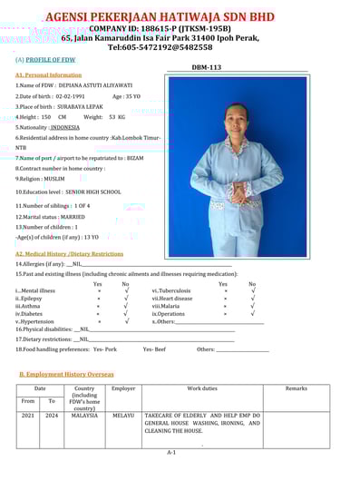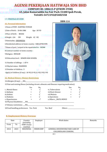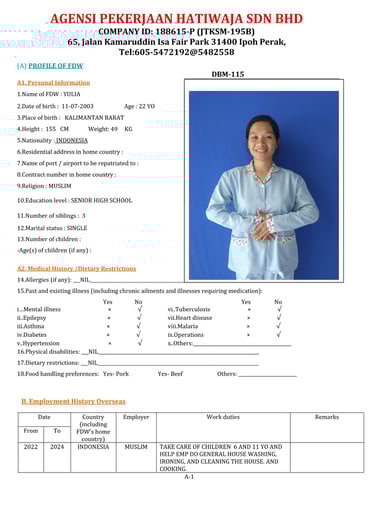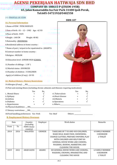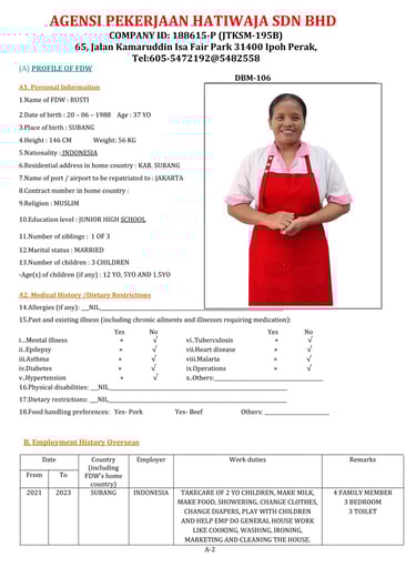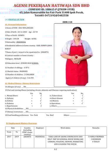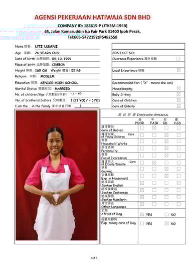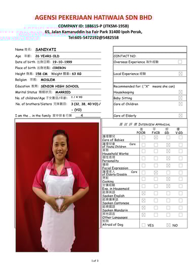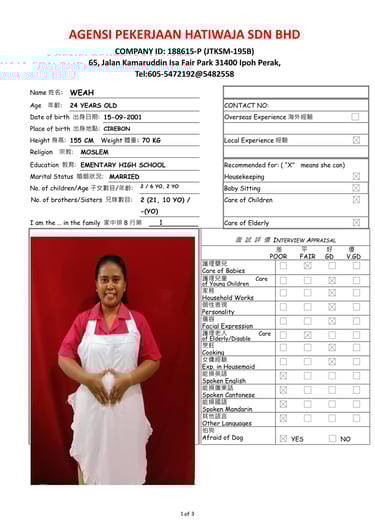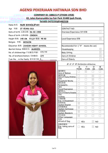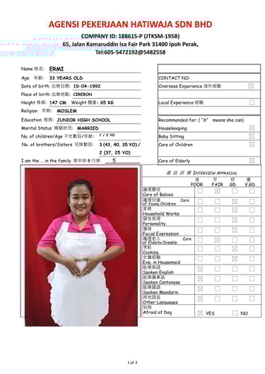 "Professional and variety choice of maids. We hired a helper to take care of our child. The agent found a perfect match for us and we're glad that the maid bond perfectly with our little girl. This is the 4th years she's with us and and she is part of the family now. Thanks for the continuous service! "